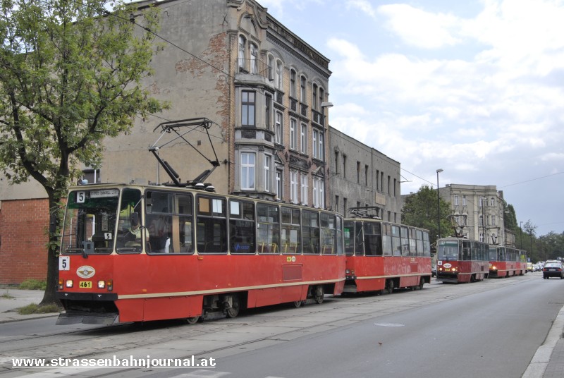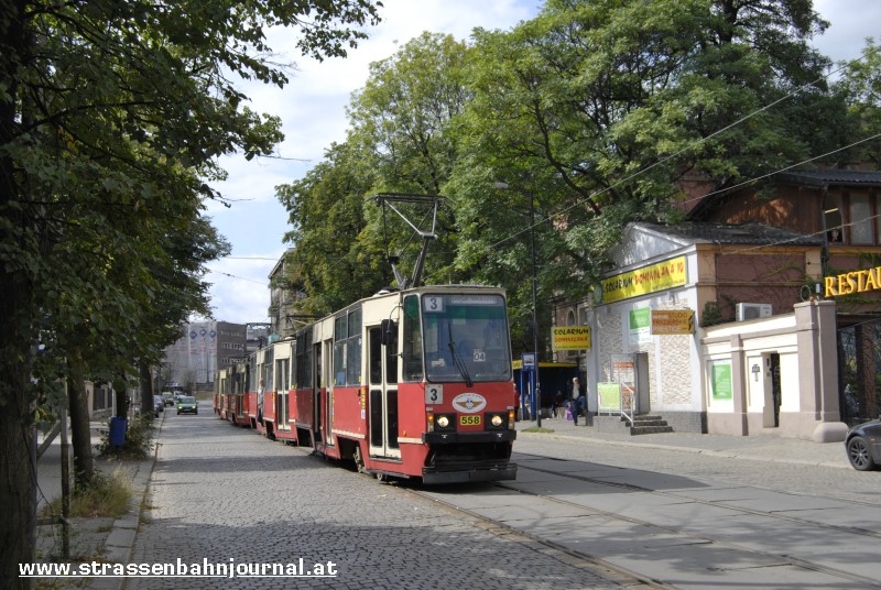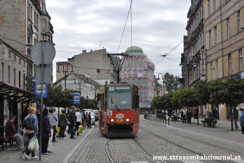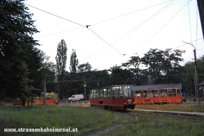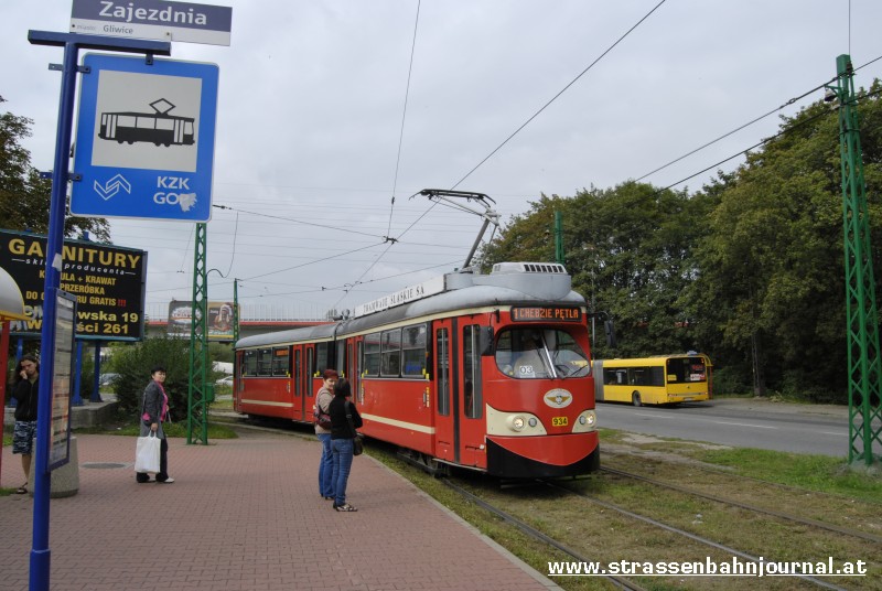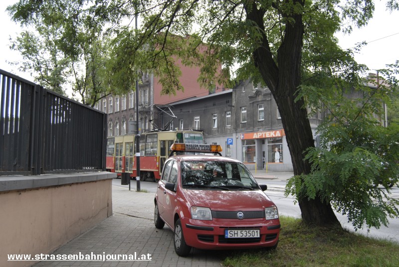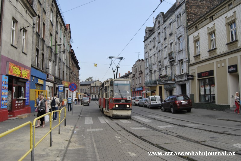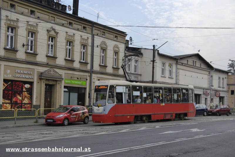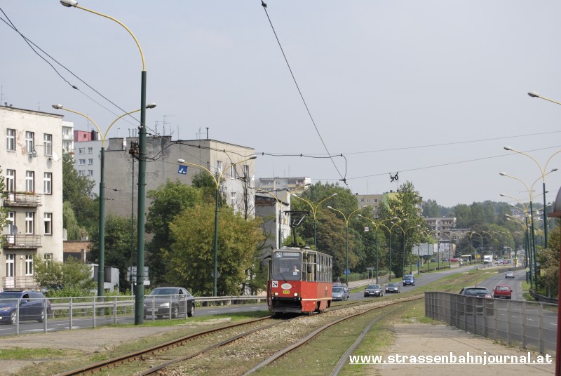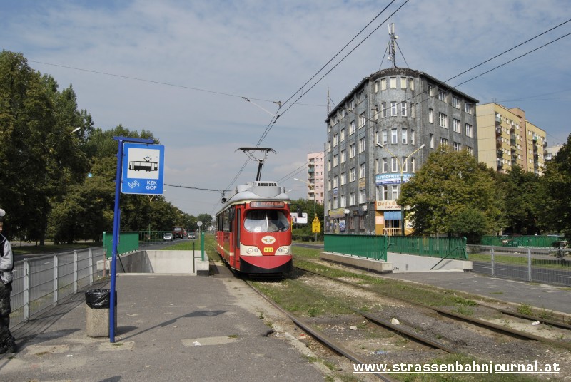 Anfang September führte eine Reise ins oberschlesische Industriegebiet (Großraum Katowice). Man kann sich diese Agglomeration etwa wie das Ruhrgebiet vorstellen: Etliche kleinere und mittlere Städte sind durch ein zusammenhängendes Straßenbahnnetz verbunden, das 2012 eine Streckenlänge von ca. 171 Kilometern aufweist. Die Straßenbahnen verkehren in den Stadtzentren entweder gemeinsam mit dem Individualverkehr oder auf selbstständigen Gleiskörpern, zwischen den dicht besiedelten Gebieten haben die Strecken durchwegs Lokalbahncharakter, oft eingleisig in Seitenlage. Typisch für die Städte sind breite Straßen, die genügend Platz für eine separierte Führung der Straßenbahn bieten wie hier in Sosnowiec, wo Triebwagen 635 auf Linie 24 in die Haltestelle Ostrogórska einfährt.