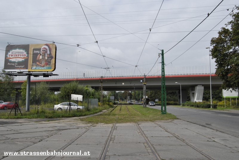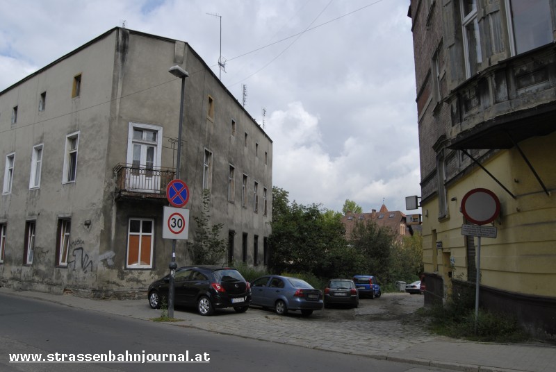 Bei der Haltestelle Wysoka trifft 920 ex 4503 auf ein etwas älteres Wohnhaus, das ringsum von den für Osteuropa typischen Plattenbauten umgeben ist. Was den Fußgängerverkehr betrifft, ist hier noch viel aufzuholen: Nicht nur an dieser Stelle wird der Fahrgast zum Überqueren der Fahrbahn in den Untergrund gedrängt. Aber auch sonst empfiehlt es sich tunlichst, beim Überqueren von Fahrbahnen in Polen große Vorsicht walten zu lassen, denn einerseits ist Autolenkern das Rechtsabbiegen bei Rot erlaubt, andererseits halten nur Fahrschulautos vor Zebrastreifen, um Fußgänger passieren zu lassen.