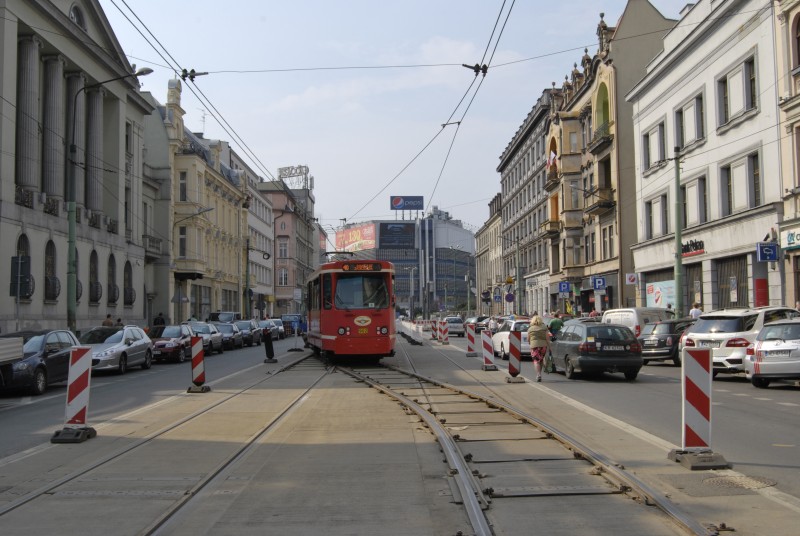 Generell ist die Infrastruktur der Straßenbahn in schlechtem Zustand. Einige Strecken wurden aber bereits modernisiert und befinden sich in mustergültigem Zustand – sowohl, was den Oberbau, aber auch, was die Haltestellen betrifft. Einziger Mangel: Es gibt generell keine dynamische Fahrgastinformation, also weder digitale Anzeigen noch Informationslautsprecher. Im Störungsfall ist man also auf Mundpropaganda, Warten oder eigenständiges Ausweichen angewiesen, doch dazu später mehr. Das Verkehrsunternehmen ist im Rahmen seiner Möglichkeiten bemüht, Verbesserungen herbeizuführen. Gleichzeitig hat man gewisses Interesse an der Vergangenheit, so wurde beispielsweise Triebwagen 338 nach einem Unfall annähernd in den Ursprungszustand zurückversetzt und ist so im Linieneinsatz zu finden, hier auf Linie 14 in Szopienice in der Obrońców Westerplatte.
