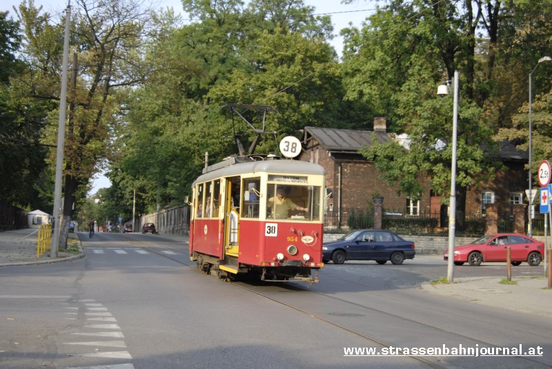 Zu guter Letzt noch ein Bild der Linie 38, die wohl den höchsten Bekanntheitsgrad aller Linien der Tramwaje Śląskie aufweist, denn sie verkehrt planmäßig mit offenen Zweiachsern des Typs Konstal N (Baujahr 1949!). Da die Strecke keine zwei Kilometer lang ist, genügt für den Normalauslauf im 20-Minuten-Takt ein einziger Wagen, hier Nr. 954 bei der Fahrt vom in der Mitte der Strecke gelegenen Friedhof Mater Dolorosa Richtung Süden ins Zentrum vom Bytom.
